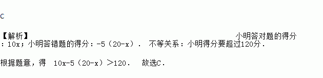 某次知识竞赛共有20道题,每一题答对得10分,答错或不答都扣5分.小明得分要超过120分,他至少要答对多少道题?如果设小明答对x道题,则他答错或不答的题数为20-x. 根据题意得:( )