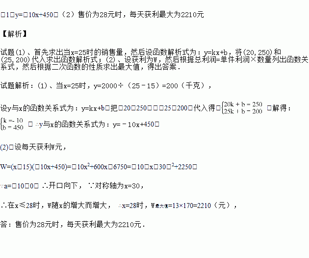 某超市销售樱桃,已知樱桃的进价为15元/千克,如果售价为20元/千克,那么每天可售出250千克,如果售价为25元/千克,那么每天可获利2000元,经调查发现:每天的销售量y(千克)与售价x(元/千克)之间存在一次函数关系.