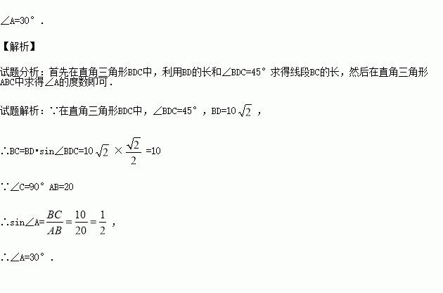 如图,△ABC中,∠C=90°,点D在AC上,已知∠BDC=45°,BD=10,AB=20.求∠A的度数.