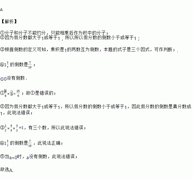 ①; ②假分数的倒数是真分数;③=1,所以、、互为倒数;④1的倒数是;⑤a的倒数是.