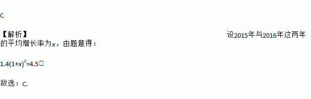 我省2014年的快递业务量为1.4亿件,受益于电子商务发展和法治环境改善等多重因素,快递业务迅猛发展, 2016年的快递业务量达到4.5亿件.设2015年与2016年这两年的平均增长率为x,则下列方程正确的是( )