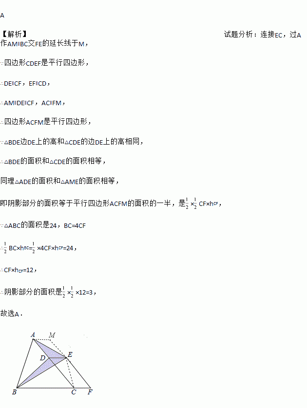 A 【解析】试题分析:连接EC,过A作AM∥BC交FE的延长线于M, ∵四边形CDEF是平行四边形, ∴DE∥CF,EF∥CD, ∴AM∥DE∥CF,AC∥FM, ∴四边形ACFM是平行四边形, ∵△BDE边DE上的高和△CDE的边DE上的高相同, ∴△BDE的面积和△CDE的面积相等, 同理△ADE的面积和△AME的面积相等, 即阴影部分的面...
