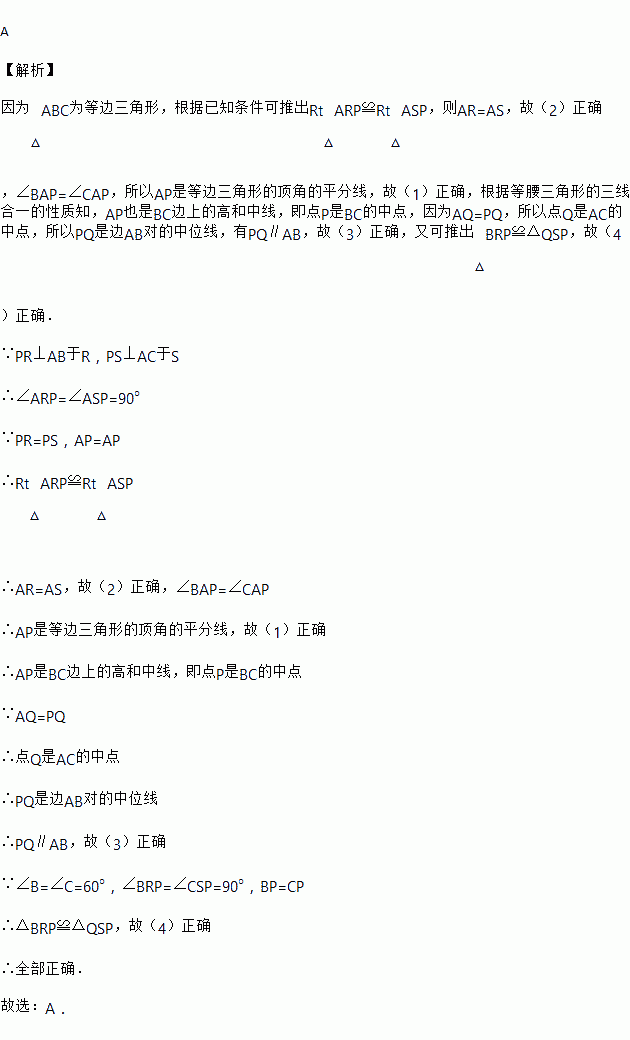 如图所示,为等边三角形,,,于R,于S,则四个结论正确的是