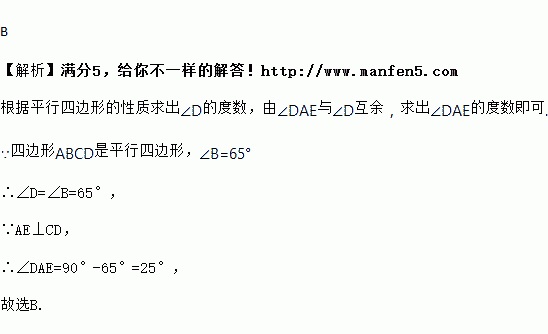 如图,在?ABCD中,AE⊥CD于点E,∠B=65°,则∠DAE等于( )