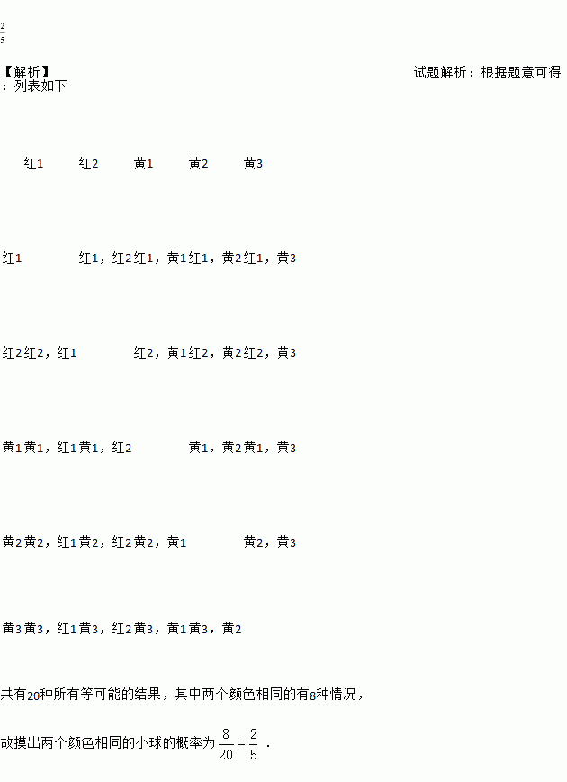 一个不透明的袋中共有5个小球,分别为2个红球和3个黄球,它们除颜色外完全相同,随机摸出两个小球,摸出两个颜色相同的小球的概率为____.