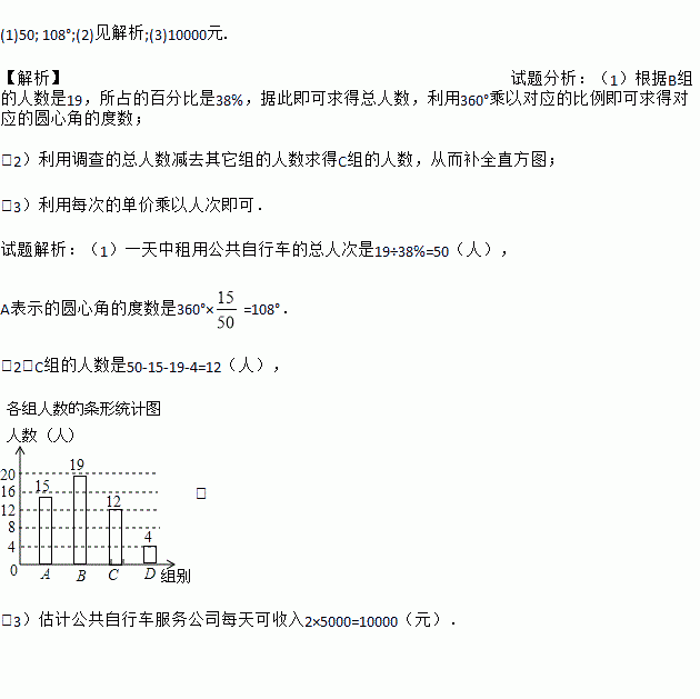 (1)50; 108°;(2)见解析;(3)10000元. 【解析】试题分析:(1)根据B组的人数是19,所占的百分比是38%,据此即可求得总人数,利用360°乘以对应的比例即可求得对应的圆心角的度数; (2)利用调查的总人数减去其它组的人数求得C组的人数,从而补全直方图; (3)利用每次的单价乘以人次即可. 试题解析:(1)一天中租用公共自行车的总人次是19÷38%=50...
