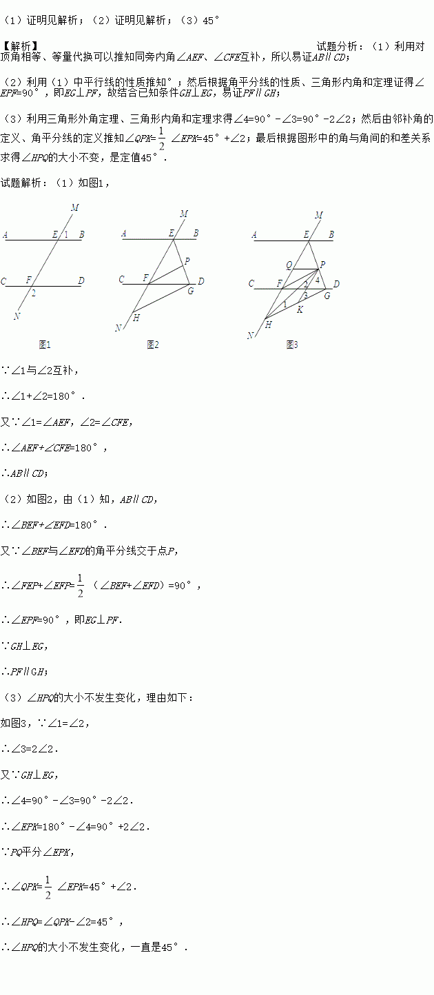 £¨3£©Èçͼ3ÔÚ£¨2£©µÄÌõ¼þÏÂÁ¬½áPH£¬KÊÇGHÉÏÒ»µãʹ¡ÏPHK£½¡ÏHPK£¬×÷PQƽ·Ö¡ÏEPK£¬ÎÊ¡ÏHPQµÄ´óСÊÇ·ñ·¢Éú±ä»¯£¿Èô²»±äÇëÇó³öÆäÖµ£®Èô±ä»¯ËµÃ÷ÀíÓÉ£®
