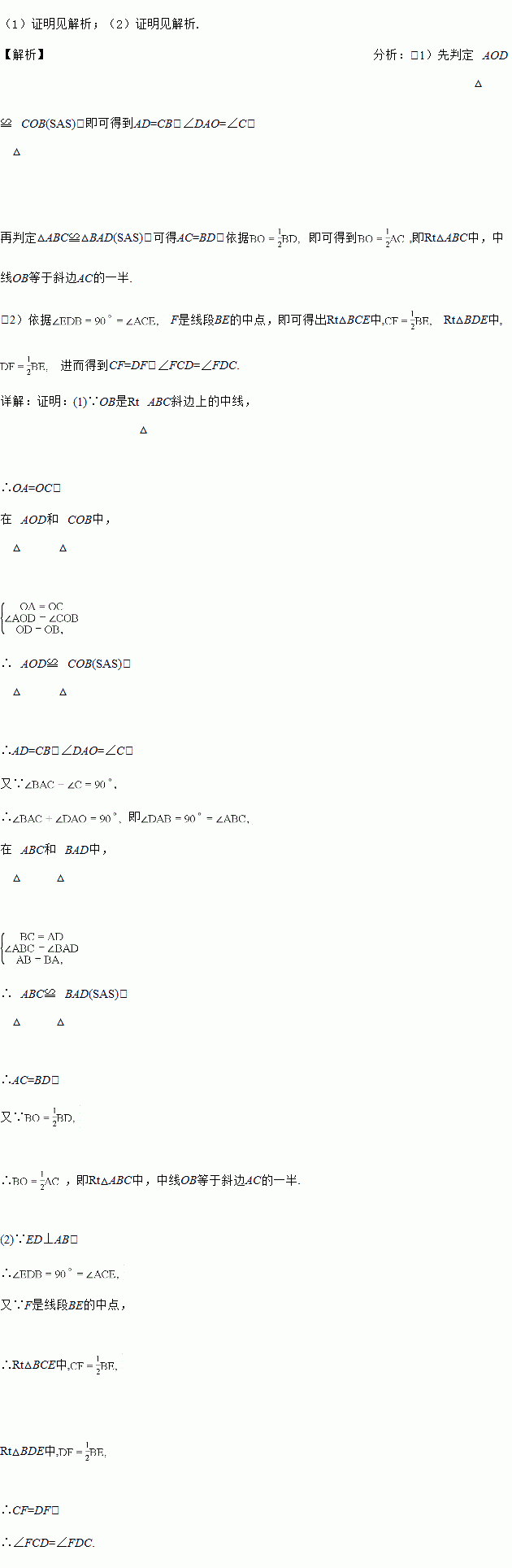 (1)如图1,OB是Rt△ABC斜边上的中线,延长BO到D,使OD=OB,连结DA.利用图1证明:中线OB等于斜边AC的一半.