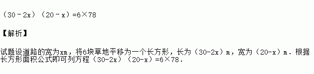 如右图,某小区规划在一个长30m、宽20m的长方形ABCD上修建三条同样宽的通道,使其中两条与AB平行,另一条与AD平行,其余部分种花草.要使每一块花草的面积都为78m2,那么通道的宽应设计成多少m?设通道的宽为xm,由题意列得方程 .