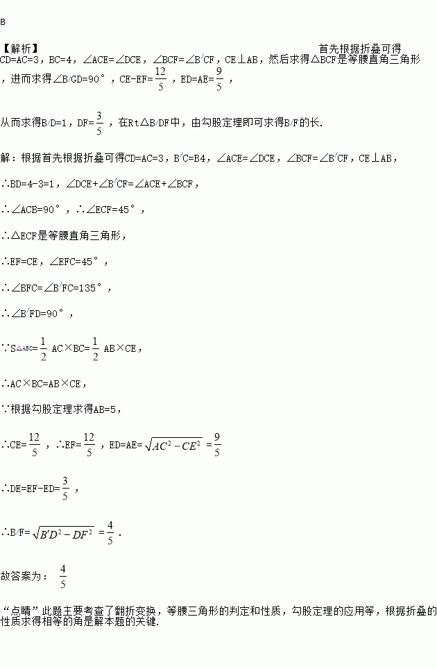 如图,Rt△ABC中,∠ACB=90°,AC=3,BC=4,将边AC沿CE翻折,使点A落在AB上的点D处;再将边BC沿CF翻折,使点B落在CD的延长线上的点B′处,两条折痕与斜边AB分别交于点E、F,则线段B′F的长为( )