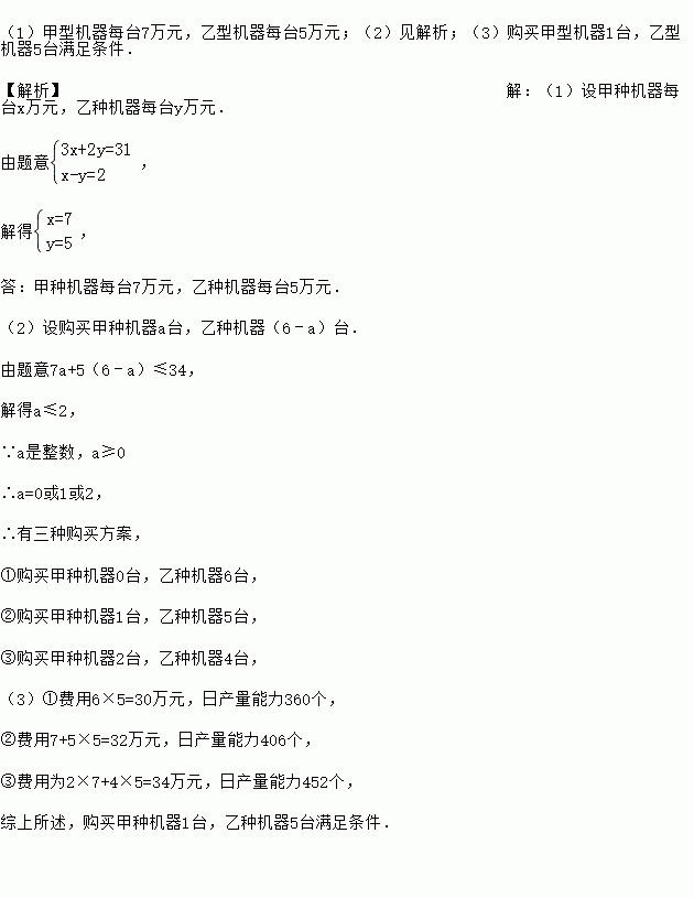 某工厂为了扩大生产,决定购买6台机器用于生产零件,现有甲、乙两种机器可供选择.其中甲型机器每日生产零件106个,乙型机器每日生产零件60个,经调査,购买3台甲型机器和2台乙型机器共需要31万元,购买一台甲型机器比购买一台乙型机器多2万元.