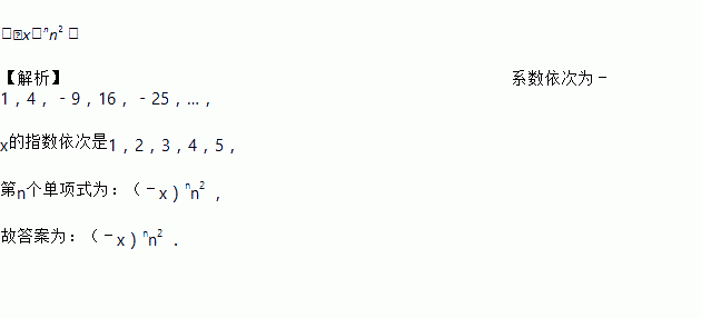 (﹣x)nn2 . 【解析】系数依次为﹣1,4,﹣9,16,﹣25,…, x的指数依次是1,2,3,4,5, 第n个单项式为:(﹣x)nn2 , 故答案为:(﹣x)nn2 .