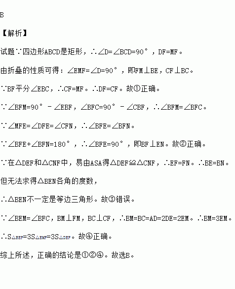 如图,在矩形ABCD中,点E是AD的中点,∠EBC的平分线交CD于点F,将△DEF沿EF折叠,点D恰好落在BE上M点处,延长BC、EF交于点N.有下列四个结论:①DF=CF;②BF⊥EN;③△BEN是等边三角形;④S△BEF=3S△DEF.其中,将正确结论的序号全部选对的是
