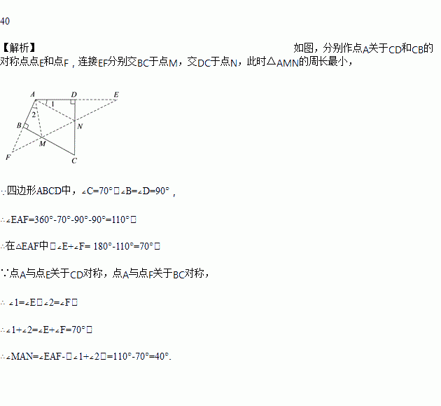 如图,四边形ABCD中,∠C=70°,∠B=∠D=90°,在BC、CD上分别找一点M、N,使△AMN周长最小,此时∠MAN的度数为_________°.