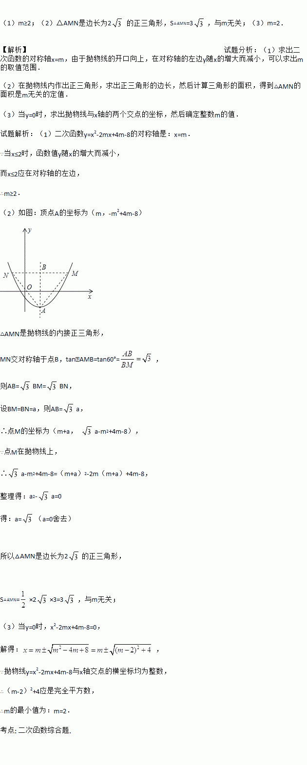 (2)以抛物线y=x2﹣2mx+4m﹣8的顶点A为一个顶点作该抛物线的内接正三角形AMN(M,N两点在拋物线上),请问:△AMN的面积是与m无关的定值吗?若是,请求出这个定值;若不是,请说明理由.