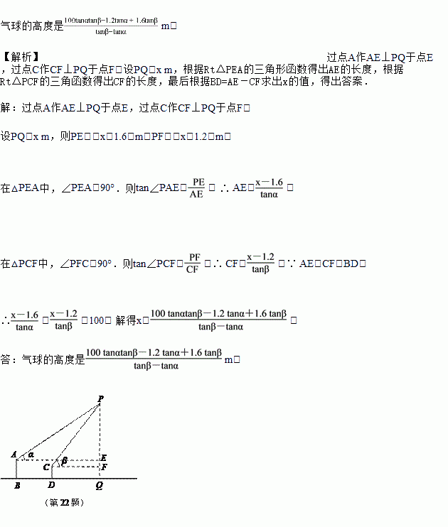 如图,爸爸和小莉在两处观测气球的仰角分别为α、β,两人的距离(BD)是100 m, 如果爸爸的眼睛离地面的距离(AB)为1.6 m,小莉的眼睛离地面的距离(CD)为1.2 m,那么气球的高度(PQ)是多少?(用含α、β的式子表示)