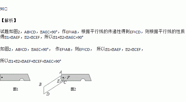 如图 1 是我们常用的折叠式小刀,图 2 中刀柄外形是一个矩形挖去一个小半圆,其中刀片的两条边缘线可看成两条平行的线段,转动刀片时会形成如图 2 所示的∠1 与∠2 ,则∠1 与∠2 的度数和是______度.
