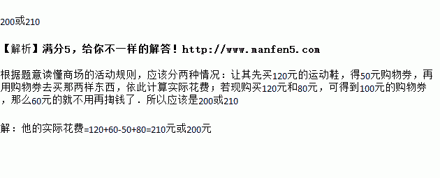 开学初,小明到某商场购物,发现商场正在进行购物返券活动,活动规则如下:购物每满100元,返购物券50元,此购物券在本商场通用,且用购物券购买商品不再返券.小明只购买了单价分别为60元、80元和120元的书包、T恤、运动鞋,在使用购物券参与购买的情况下,他的实际花费为 元.