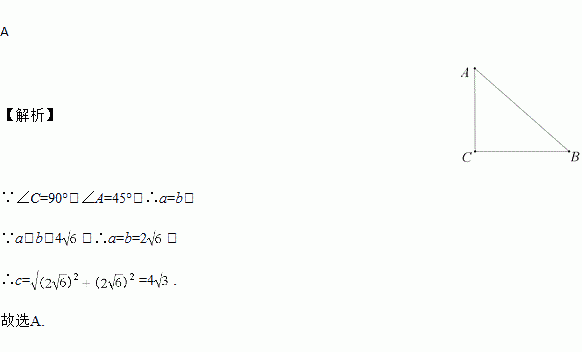 在Rt△ABC中,∠C=90°,∠A=45°,a+b=4,则c等于( )