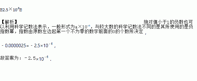 ﹣2.5×10﹣6. 【解析】绝对值小于1的负数也可以利用科学记数法表示,一般形式为a×10-n,与较大数的科学记数法不同的是其所使用的是负指数幂,指数由原数左边起第一个不为零的数字前面的0的个数所决定, ﹣0.0000025=﹣2.5×10﹣6, 故答案为:﹣2.5×10﹣6.