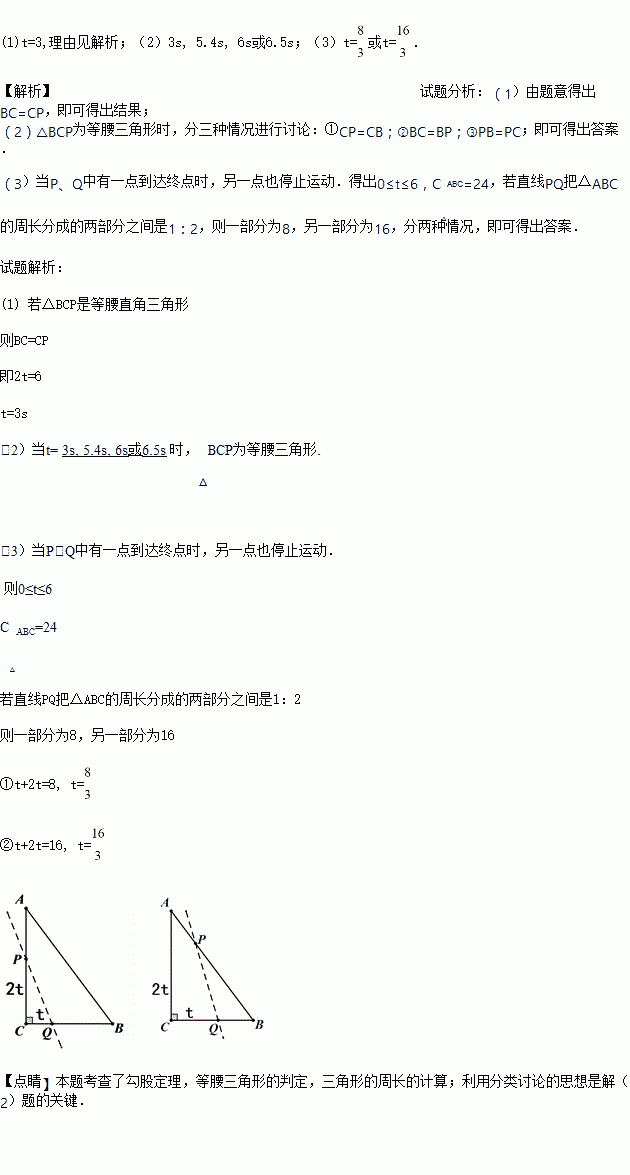 (3)另有一点Q,从点C开始,按C→B的路径运动,且速度为1cm/s,若P、Q两点同时出发,当P、Q中有一点到达终点时,另一点也停止运动.当t为何值时,直线PQ把△ABC的周长分成的两部分之间是2倍关系?