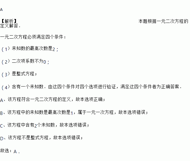 A. x2-4=0 B. x2++4=0 C. x2+2x+1=0 D. 3x2+x+1=0