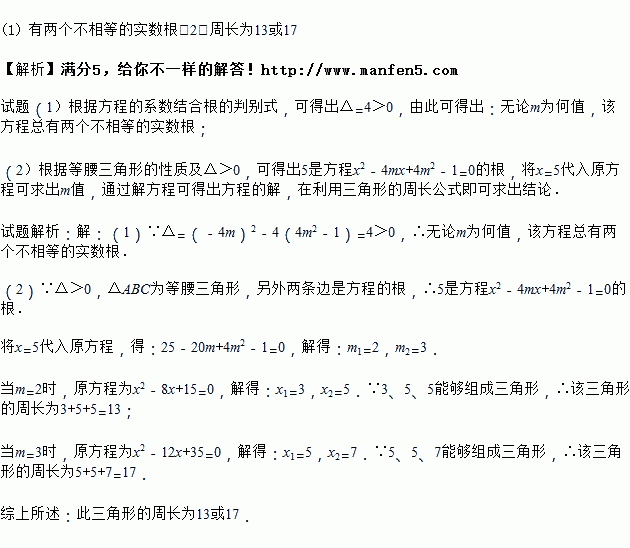 (2)若△ABC为等腰三角形,BC=5,另外两条边是方程的根,求此三角形的周长.2