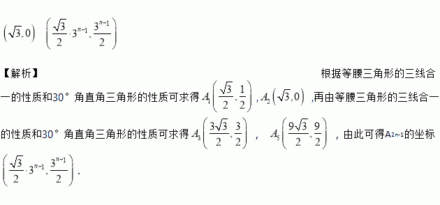 Èçͼ£¬µãA2£¬A4¡·Ö±ðÊÇxÖáÉϵĵ㣬µãA1£¬A3£¬A5£¬¡·Ö±ðÊÇÉäÏßOA2n-1Éϵĵ㣬¡÷OA1A2£¬¡÷OA2A3£¬¡÷OA3A4£¬¡·Ö±ðÊÇÒÔOA2£¬OA3£¬OA4 £¬OA5¡Îªµ×±ßµÄµÈÑüÈý½ÇÐΣ¬ÈôOA2n-1ÓëxÖáÕý°ëÖáµÄ¼Ð½ÇΪ30¡ã£¬OA1=1£¬Ôò¿ÉÇóµÃµãA2µÄ×ø±êÊÇ________£»A2n-1µÄ×ø±ê_______.