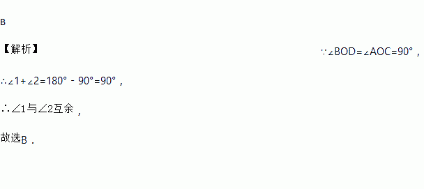 B 【解析】∵∠BOD=∠AOC=90°, ∴∠1+∠2=180°﹣90°=90°, ∴∠1与∠2互余, 故选B.