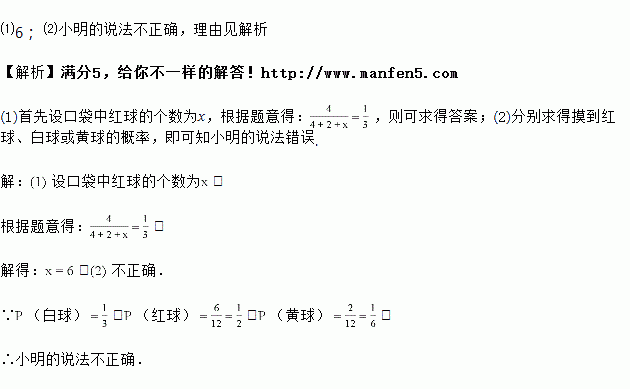 小明说:“口袋中共有三种颜色的球,所以从袋中任意摸出一球,摸到红球、白球或黄球的概率都是![]()