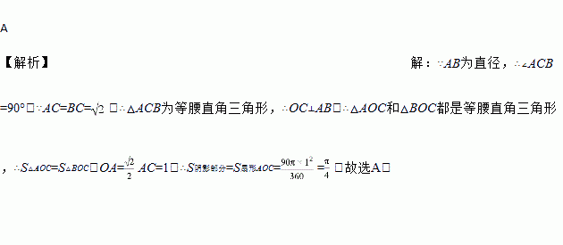 (2016重庆市)如图,以AB为直径,点O为圆心的半圆经过点C,若AC=BC=,则图中阴影部分的面积是( )