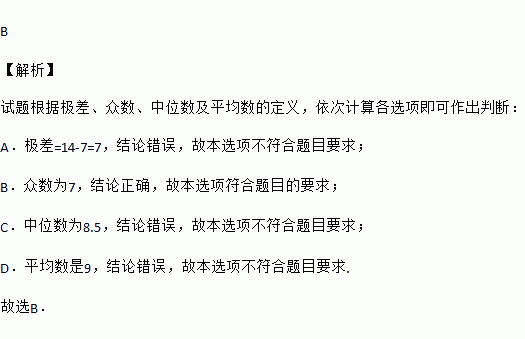 A. 极差是6 B. 众数是7 C. 中位数是8 D. 平均数是10