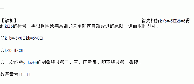 若函数y=kx+b中k+b=﹣5,kb=6,则这个函数的图象不经过第_________象限.