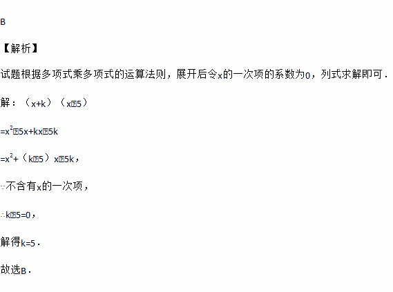 若(x+k)(x﹣5)的积中不含有 x 的一次项,则 k 的值是( )