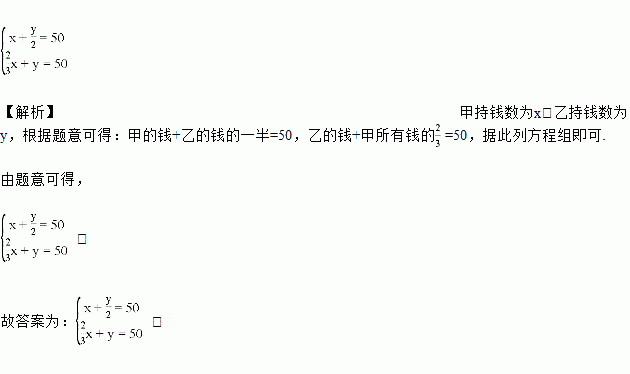 的钱给乙,则乙的钱数也能为50.问甲、乙各有多少钱?”设甲持钱数为x,乙持钱数为y,可列方程组为_____.