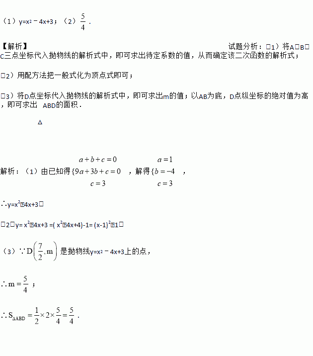 (1)y=x2﹣4x+3;(2). 【解析】试题分析:(1)将A、B、C三点坐标代入抛物线的解析式中,即可求出待定系数的值,从而确定该二次函数的解析式; (2)用配方法把一般式化为顶点式即可; (3)将D点坐标代入抛物线的解析式中,即可求出m的值;以AB为底,D点纵坐标的绝对值为高,即可求出△ABD的面积. 解析:(1)由已知得,解得, ∴y=x2﹣4x+3; ...