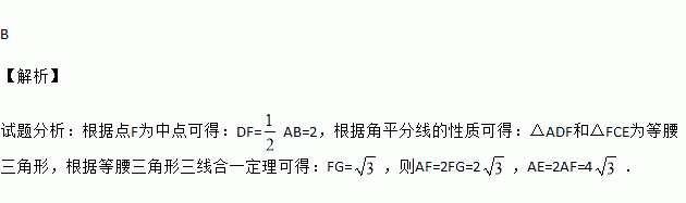 如图,在平行四边形ABCD中,AB=4,∠BAD的平分线与BC的延长线交于点E,与DC交于点F,且点F为边DC的中点,DG⊥AE,垂足为G,若DG=1,则AE的长为( )