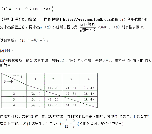 (3)从选航模项目的4名学生中随机选取2名学生参加学校航模兴趣小组训练,请用列举法(画树状图或列表)求所选取的2名学生中恰好有1名男生、1名女生的概率.