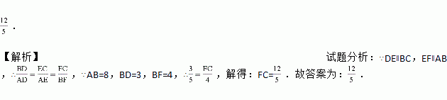如图,在△ABC中,点D,E,F分别在AB,AC,BC上,DE∥BC,EF∥AB.若AB=8,BD=3,BF=4,则FC的长为_____.