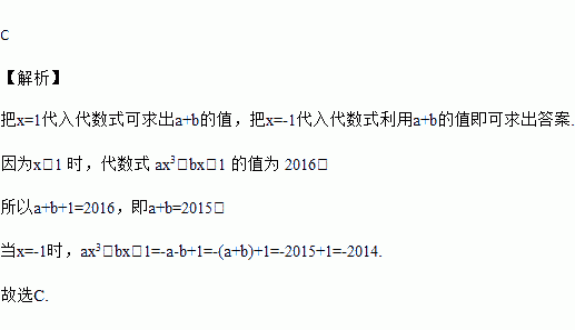 已知当 x=1 时,代数式 ax3+bx+1 的值为 2016,则当 x=-1 时,代数式 ax3+bx+1 的值为( )