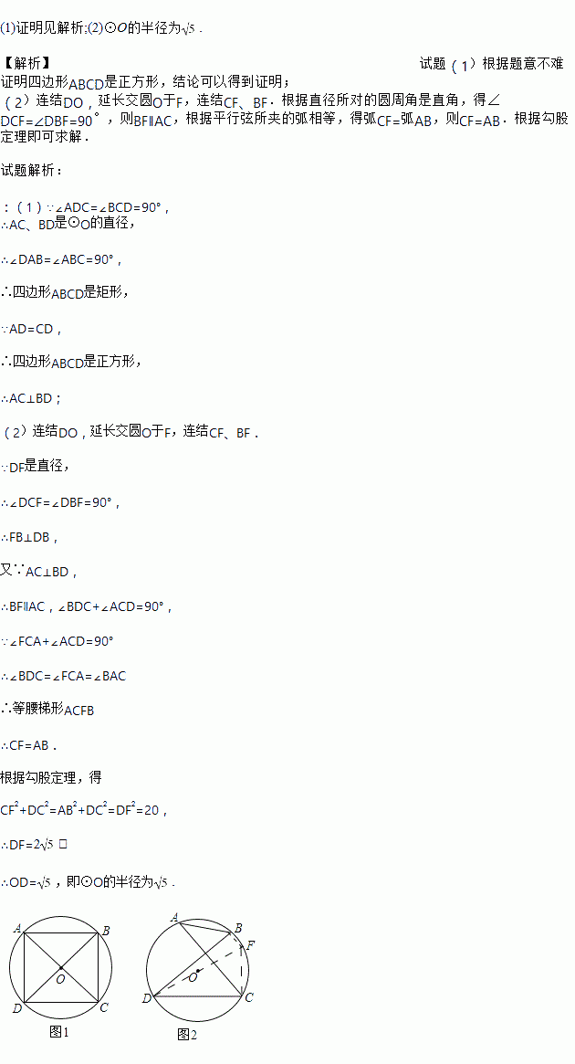 (2)如图②,若AC⊥BD,垂足为F,AB=2,DC=4,求⊙O的半径.