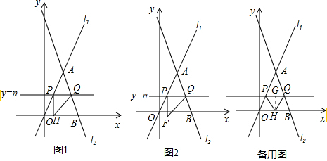 如图1,直线l1:y=2x与直线l2:y=-3x+6相交于点A,直线l2与x轴交于点B,平行于x轴的直线y=n分别交直线l1、直线l2于P、Q两点(点P在Q的左侧)