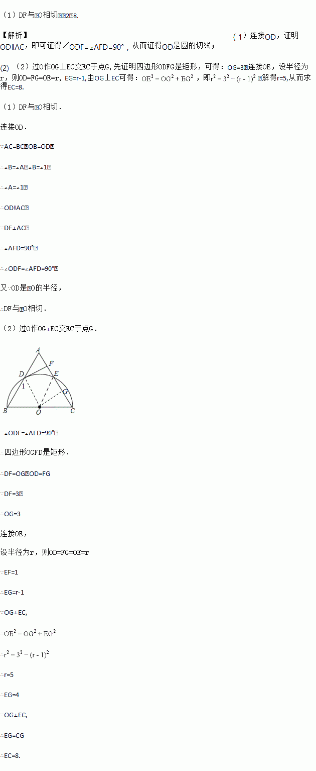 如图,△ABC为等腰三角形,AC=BC,以边BC为直径的半圆与边AB,AC分别交于D,E两点,过点D作DF⊥AC,垂足为点F