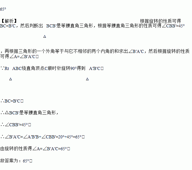 如图,将Rt△ABC绕直角顶点C顺时针旋转90°,得到△A′B′C,连接BB',若∠A′B′B=20°,则∠A的度数是_____.