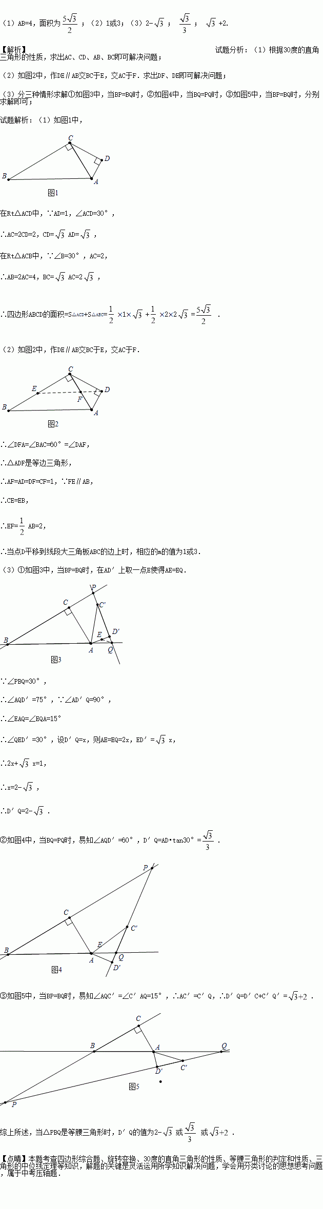 (3)如图③,小明将小三角板ACD绕点A逆时针旋转一个角α(0°<α<180°),记旋转中的△ACD为△AC′D′,在旋转过程中,设C′D′所在的直线与直线BC交于点P,与直线AB交于点Q.是否存在这样的P、Q两点,使△BPQ为等腰三角形?若存在,请直接求出此时D’Q的长;若不存在,请说明理由.