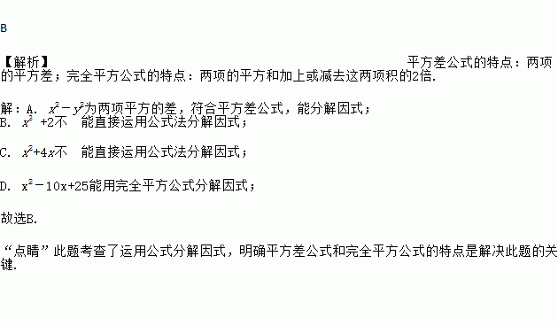 下列各多项式中: ① x2-y2,② x3 +2,③ x2+4x,④ x2-10x+25,其中能直接运用公式法分解因式的个数是( )