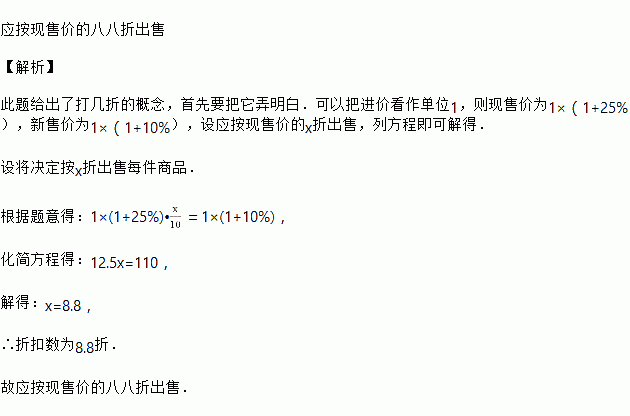 某件商品的价格是按获利润25%计算出的,后因库存积压和急需加收资金,决定降价出售,如果每件商品仍能获得10%的利润,试问应按现售价的几折出售?(减价到原标价的百分之几就叫做几折,例如标价一元的商品售价七角五分,叫做“七五折”)