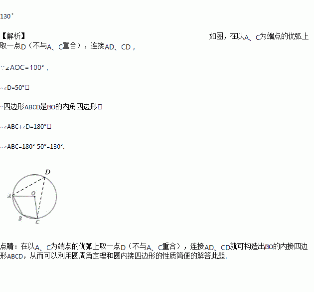 如图,A、B、C三点在⊙O上,∠AOC=100°,则∠ABC=_______°.