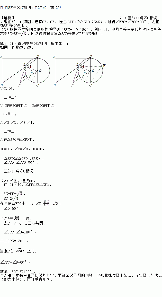 (1)试判断EF与⊙O的位置关系,并说明理由.