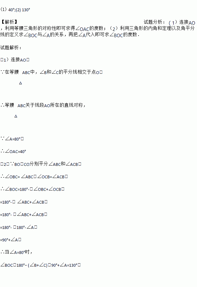 如图,在等腰△ABC中,∠A=80°,∠B和∠C的平分线相交于点O